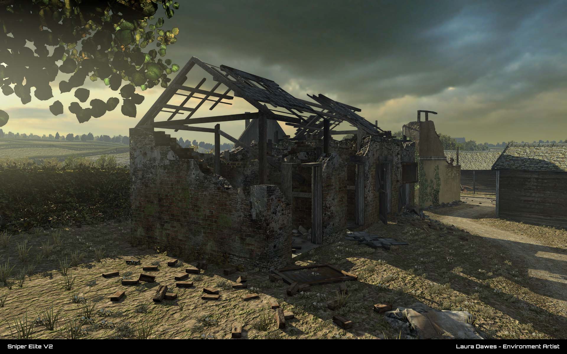 This is a downloadable additional level for Sniper V2 that I worked on with one other environment artist. I gathered lots of reference and built a couple of new buildings from scratch for this environment. I made most of the other buildings by recycling things from the main game. I built the surrounding vista from more recycled parts and I did most of the set dressing, including making some new props such as the hanging baskets.
